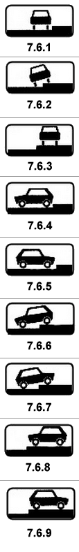 7.6.1 указывает, что все транспортные средства должны быть поставлены на проезжей части вдоль тротуара; 7.6.2 - 7.6.9 указывают способ постановки легковых автомобилей и мотоциклов на околотротуарной стоянке. Применяются со знаком